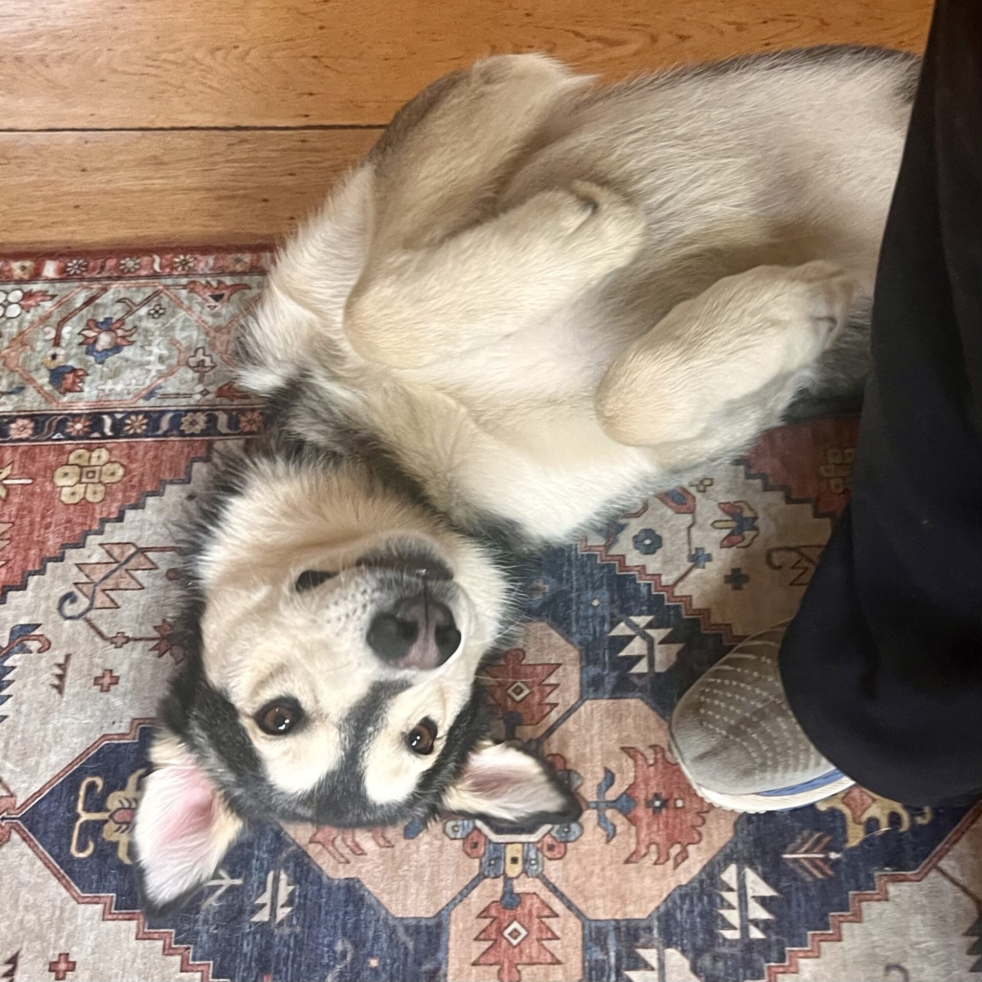 Obedient, kind, hopeful and in-your-lap affectionate. Drop the stereotypes. He appears to be a Husky/Shepherd type dog (check back soon for Embark results!) but is not an escape artist, he doesn’t howl. He’s a bit of a nerd who wants to belong, so stays close to his people and nudges in for head rubs when he can.