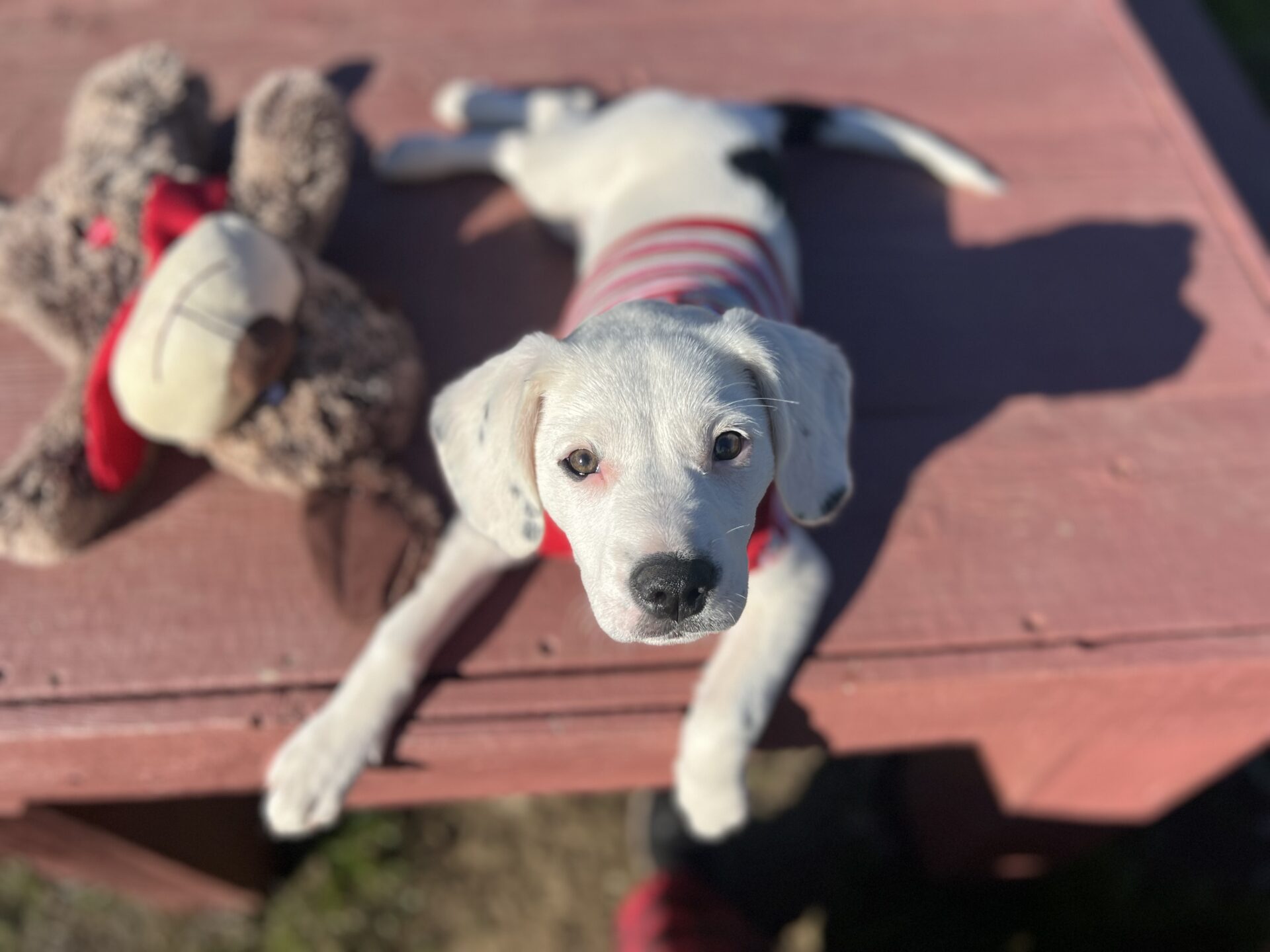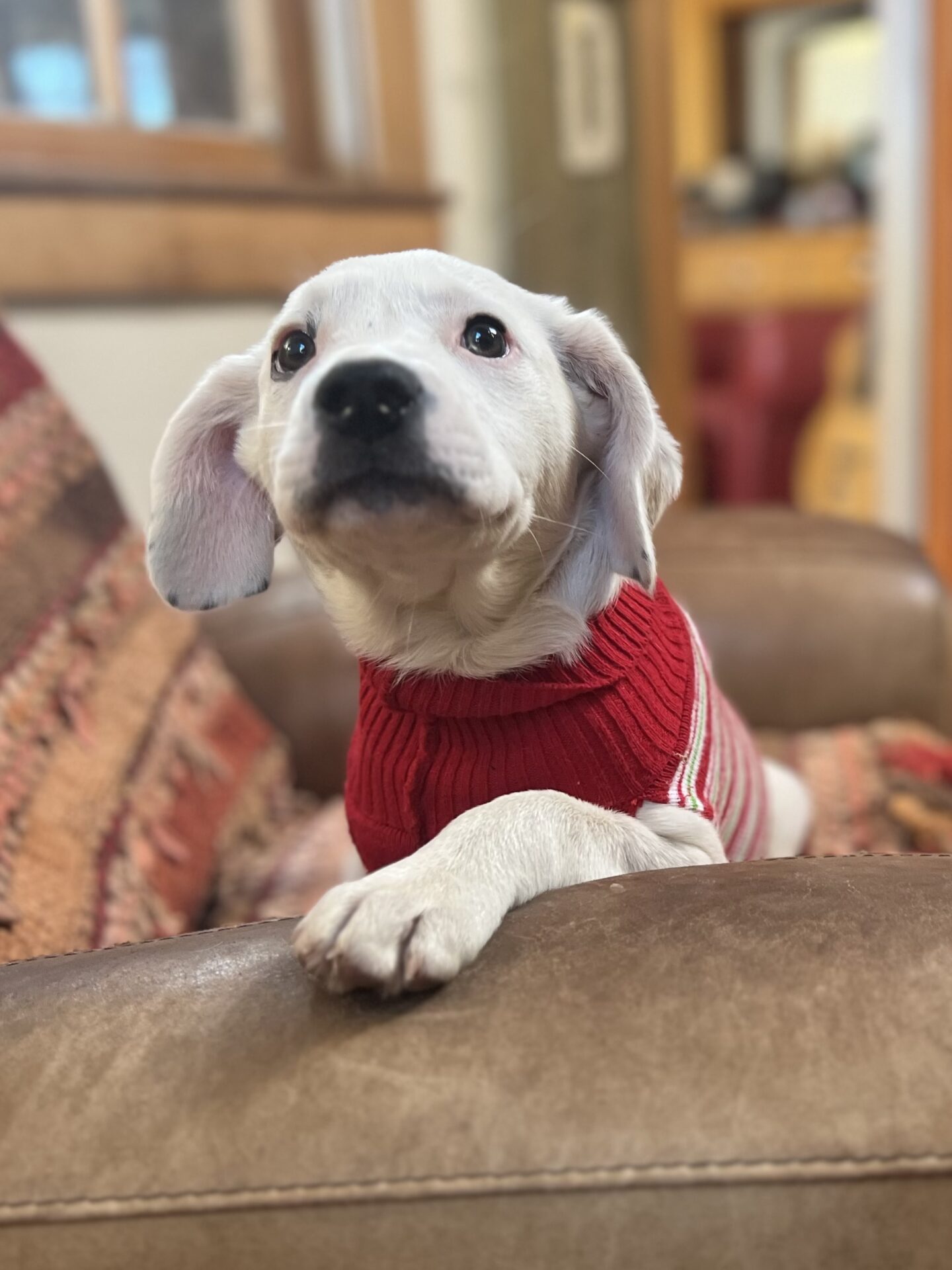 We don’t know what her breed mix is, but she’s got the smarts and the spunk of a terrier (American Pit Bull Terrier mix?), the ears of a hound dog and the spunk of a small dog. Whatever she is, she’s absolutely delightful.