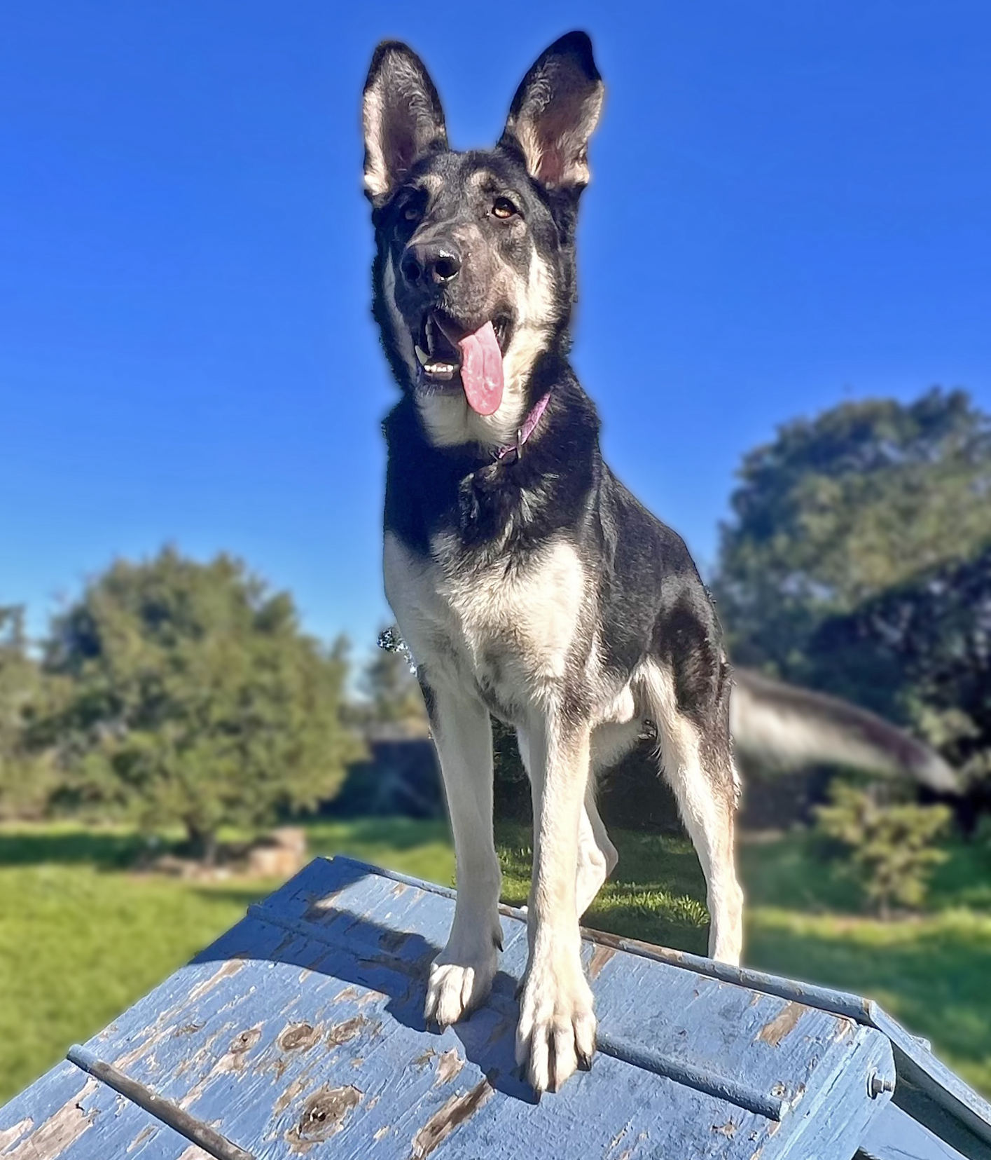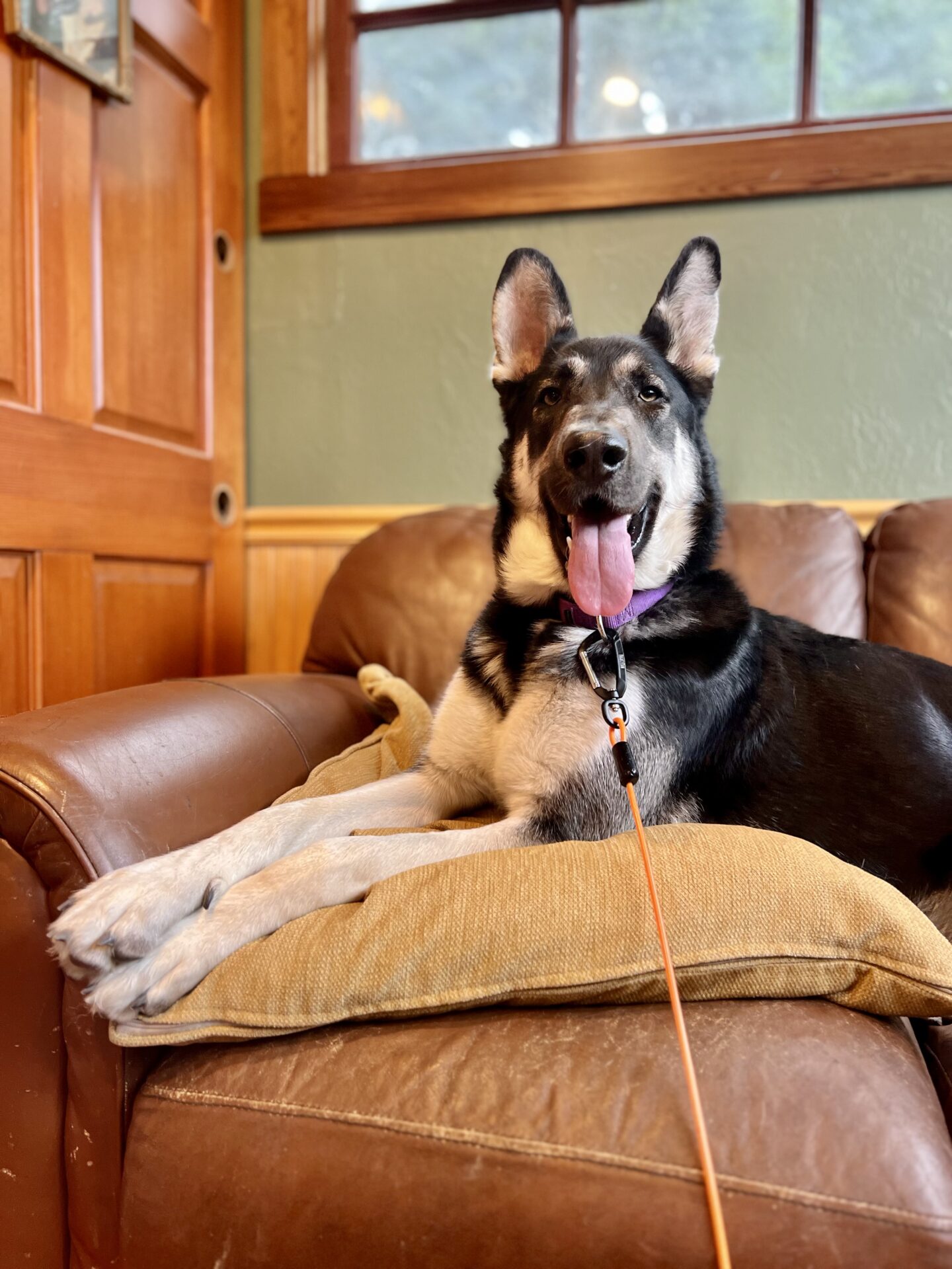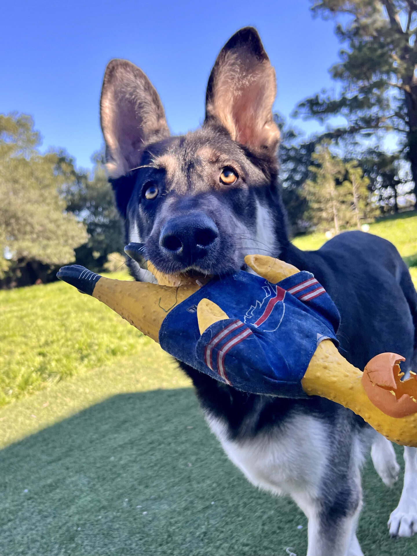 His personality is basically a 4month old puppy in an adult dog body. He loves all this human caretakers and will sorta go overboard with Numan style hugs. Then he’ll pick up his prize squeaky chicken and toss it around in a celebratory dance of joy.