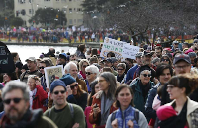 We soon had to give up on keeping track of our friends – The crowd was just too massive. (One in 45 California residents marched. An estimated 100K counted in Oakland and upwards of 4.6+ million just in the US). While waiting for some kind of announcement to signal the start, we were squeezed into a shoulder to shoulder, slow motion lava flow down Madison Street with the impressively resilient Lolo. Drums were beating, people bopping up and down, pink hats, strollers, kids on parents shoulders, a cornucopia of signs. Everyone smiling and there was chanting and high five-ing and hugging. Wait. We’re crammed like sardines, we don’t know what the plan is or where the next bathroom will be. Why are we all so HAPPY? Then the realization that the march had started, and without knowing it, we were already in way deep.